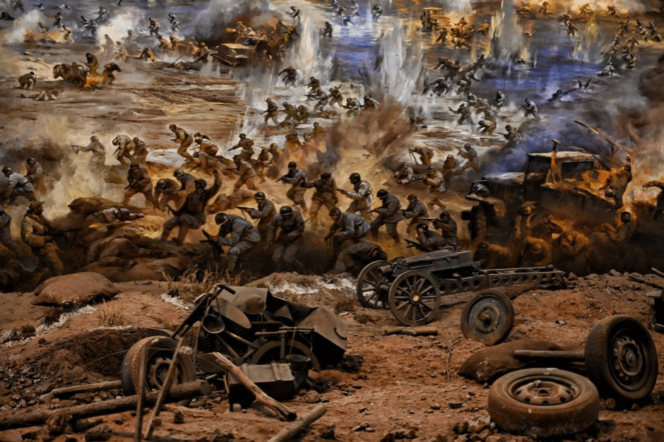 本次参观最震撼的无疑是全景画馆,师生们步入360度环形剧场,巨幅油画、逼真地面塑形与声光电技术完美融合,瞬间置身于1947年2月莱芜城北的激战现场。震耳的炮火、冲锋的号角、战士的呐喊与火光硝烟交织,生动再现了解放军战士冒着枪林弹雨、前仆后继冲锋的壮烈场景。